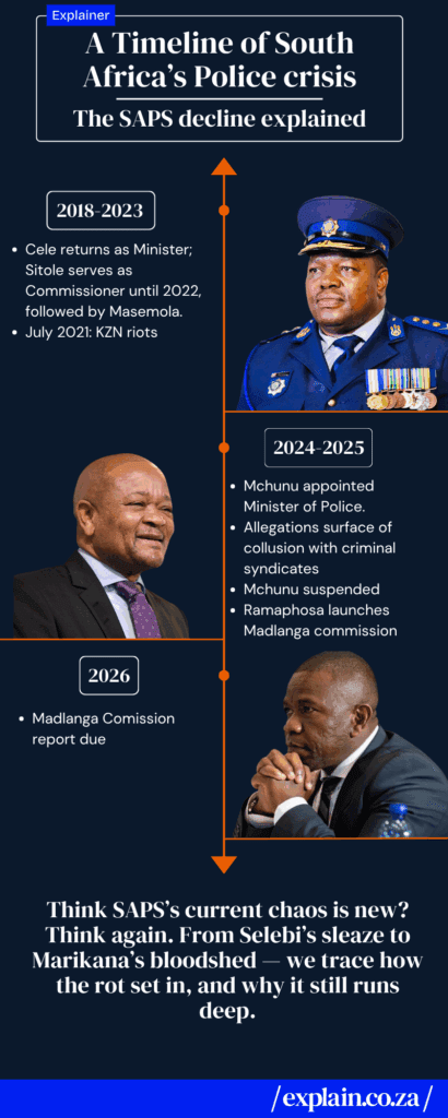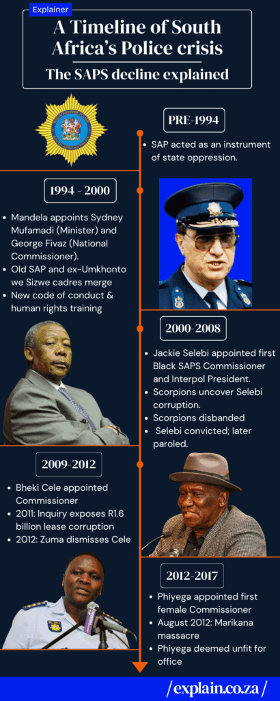 Pull it all together, and you see the patterns: apartheid’s authoritarian DNA, half-baked reforms, scandals, and politics treating SAPS like a personal fiefdom.